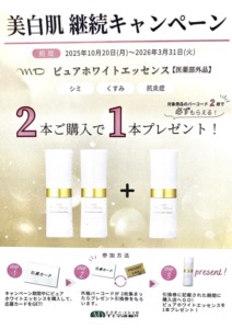 過去最大の特典かも⁉️M D化粧品 美白肌キャンペーン‼️ ピュアホワイト2本ご購入で1本プレゼント